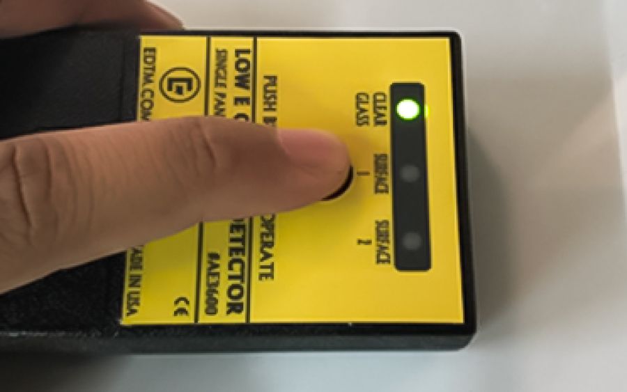 Verifies the presence and orientation of Low-E coating using a digital meter to ensure the correct reflective side is installed, optimizing energy efficiency and performance.