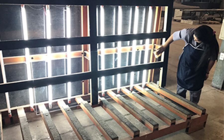 Each glass panel is inspected under backlight conditions to detect surface scratches, edge defects, or visual distortions that could affect façade appearance.